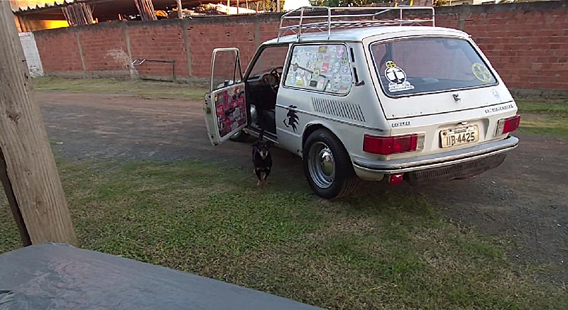Toda vez que ia lá, e foram muitas de janeiro até julho, eu sempre parava fazia carinho no Bob, jogava bolinha, desenvolvemos uma amizade. Tenho vários registros nos meus vídeo, porque gravava quase tudo referente aos carros pra postar no Youtube. E ele aparece pela primeira vez dia 22 de janeiro de 2025. E a a última lá no estacionamento em 13 de junho. Nesse dia ele tentou entrar dentro da Brasília (frame do vídeo abaixo), ele ficou me rondando, pedindo carinho e eu fiquei mal por ter deixado ele lá.